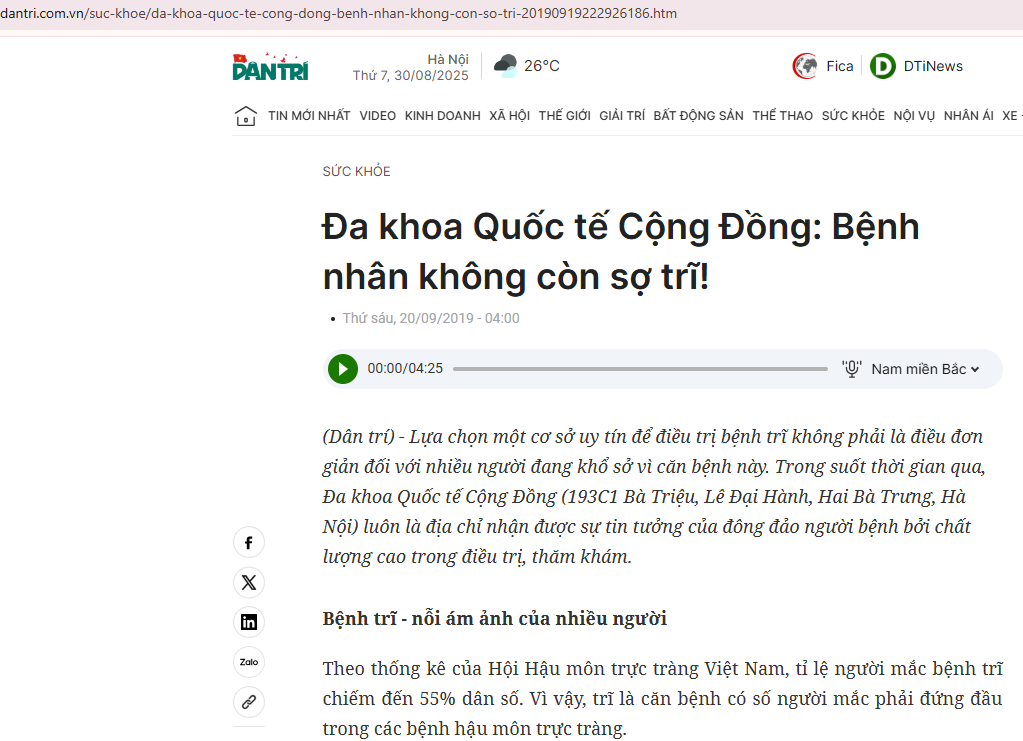 - Dân Trí – “Đa khoa Quốc tế Cộng Đồng: Bệnh nhân không còn sợ trĩ!” => 🔗 Link: dantri.com.vn