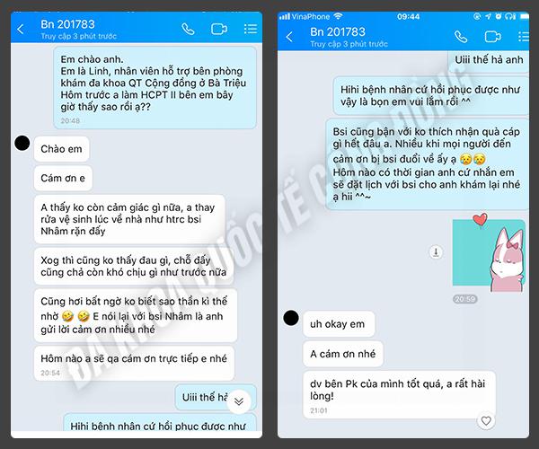 “Toàn bộ quá trình diễn ra rất nhanh, tôi gần như không cảm thấy đau. Chỉ sau vài ngày tuân thủ theo đúng hướng dẫn của bác sĩ tôi là có thể đi lại bình thường, sinh hoạt thoải mái. Giờ ăn uống dễ chịu hơn, không còn cảm giác sợ mỗi lần đi vệ sinh nữa. Quả đúng là phương pháp HCPT II thật sự mang lại hiệu quả rõ rệt, vừa an toàn, vừa giúp mình lấy lại tự tin và chất lượng cuộc sống!”